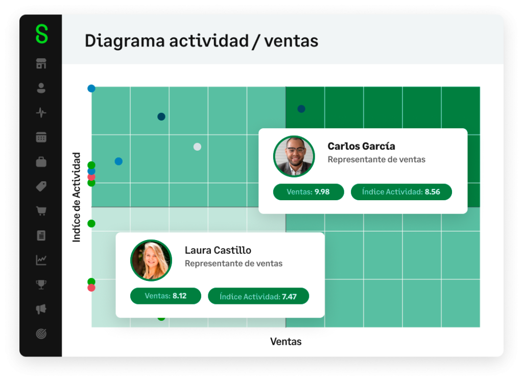 Un claro ejemplo es el cuadrante de actividad – ventas de Sage Sales Management que posiciona a cada comercial en un cuadrante concreto. Para que esto sea eficaz y exacto es imprescindible reportar la información comercial en tiempo real para que el director pueda ver y aconsejar sobre cómo enfoca las cuentas y las ventas cada comercial.